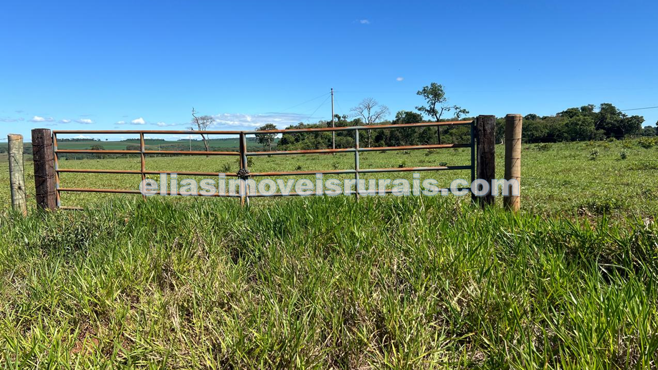 Está formada com pastagem de braquiarão e toda cercada com cercas no modelo paraguaia.